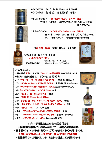 ●持込ワイン・日本酒: 持込料4000円/本